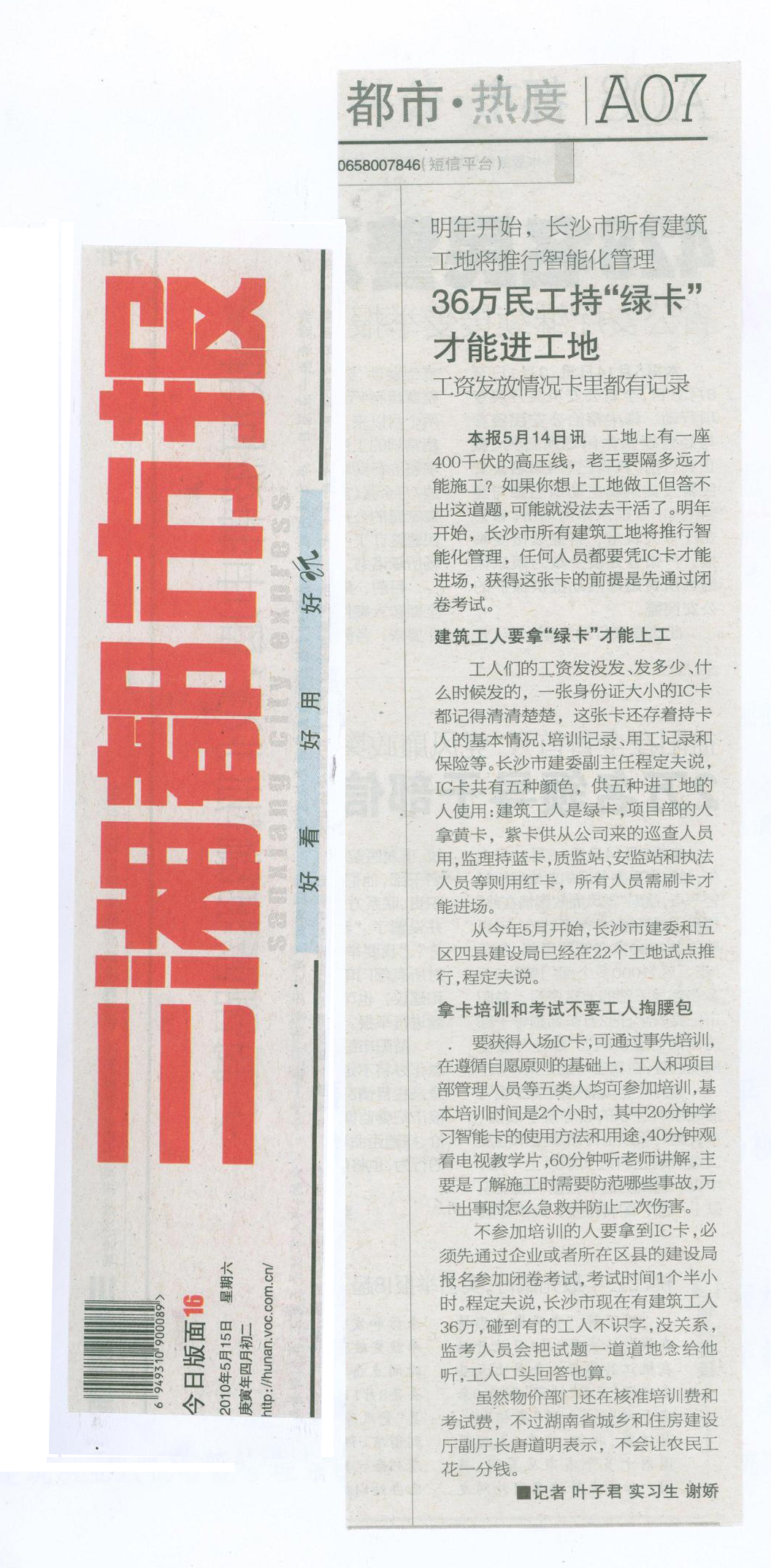 三湘都市報刊登《36萬民工持“綠卡”才能進工地》
